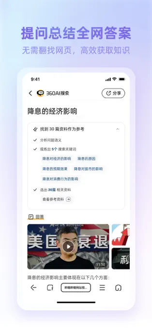 - 360AI搜索:自动总结全网信息,无需翻找多个网页,快速获取高效知识。新增模型切换功能,思考过程更清晰,能深入解析搜索结果,呈现优质内容。
