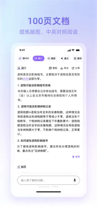 - PDF总结:一键总结外文文献、报告、论文,消除语言障碍。适用于学术研究和专业阅读,帮助用户快速获取关键信息。