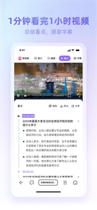 - 视频总结:快速提炼视频要点,1小时视频只需1分钟即可迅速领悟。支持提取字幕和定位视频位置,方便用户找到精彩片段。